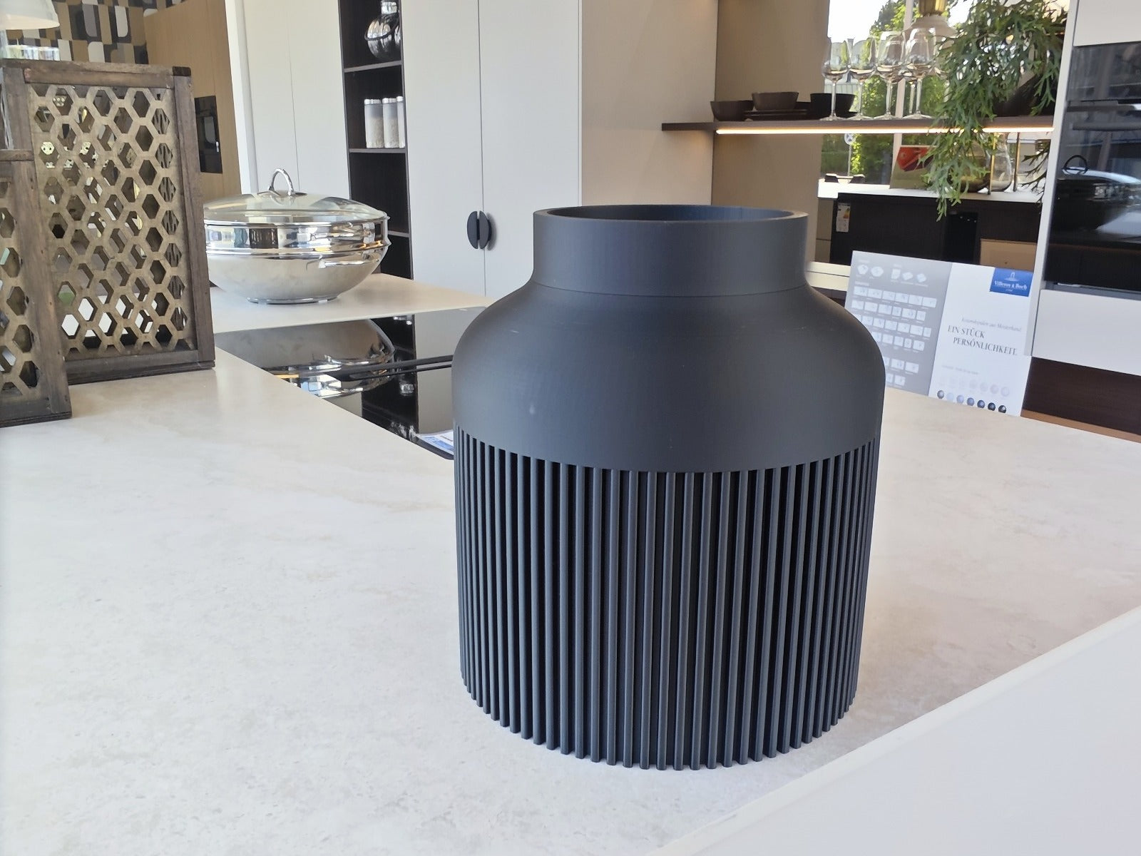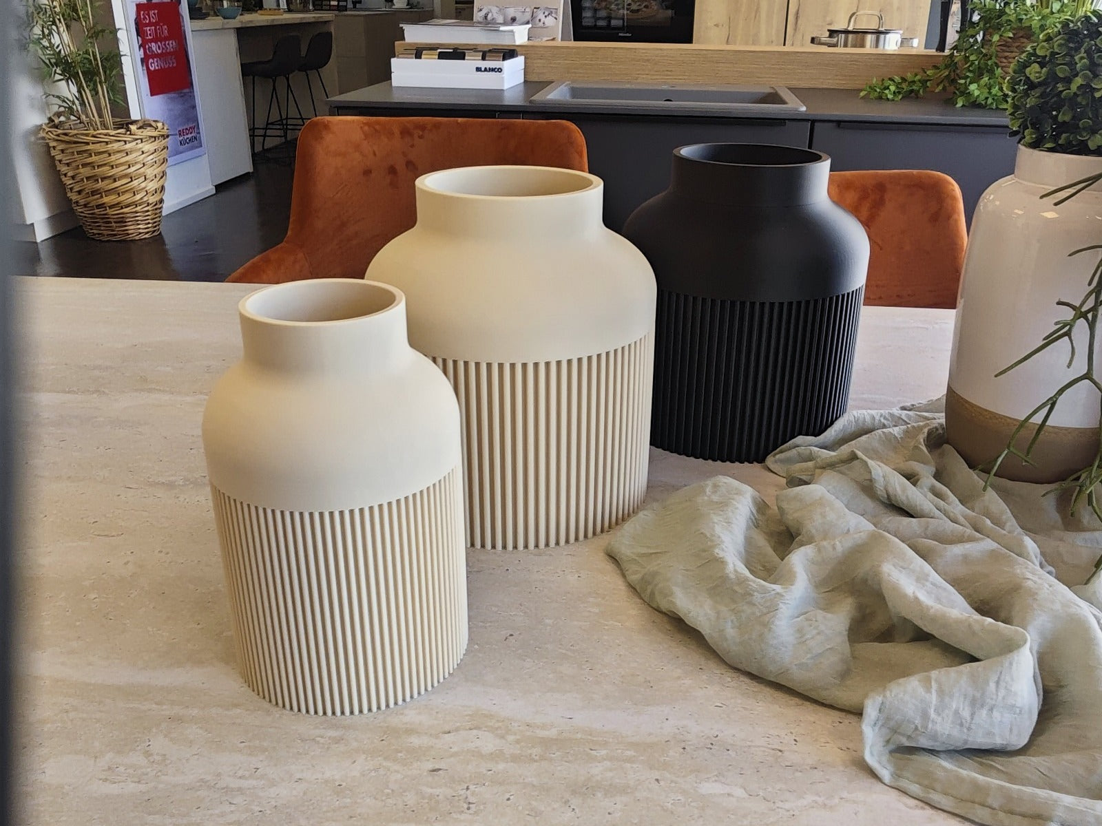 Diese stilvolle 3D-gedruckte Japandi Vase verbindet die schlichte Eleganz des japanischen Minimalismus mit der warmen Natürlichkeit skandinavischen Designs. Ihre klare Form mit feiner Rillenstruktur macht sie zu einem modernen Blickfang, der in jedem Raum harmonisch wirkt.