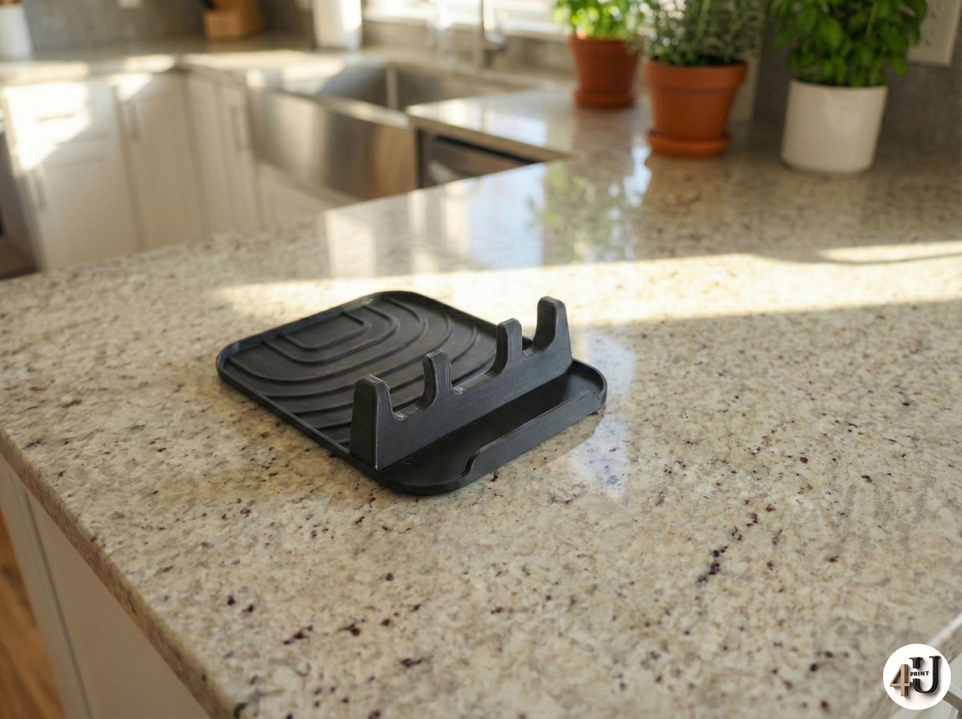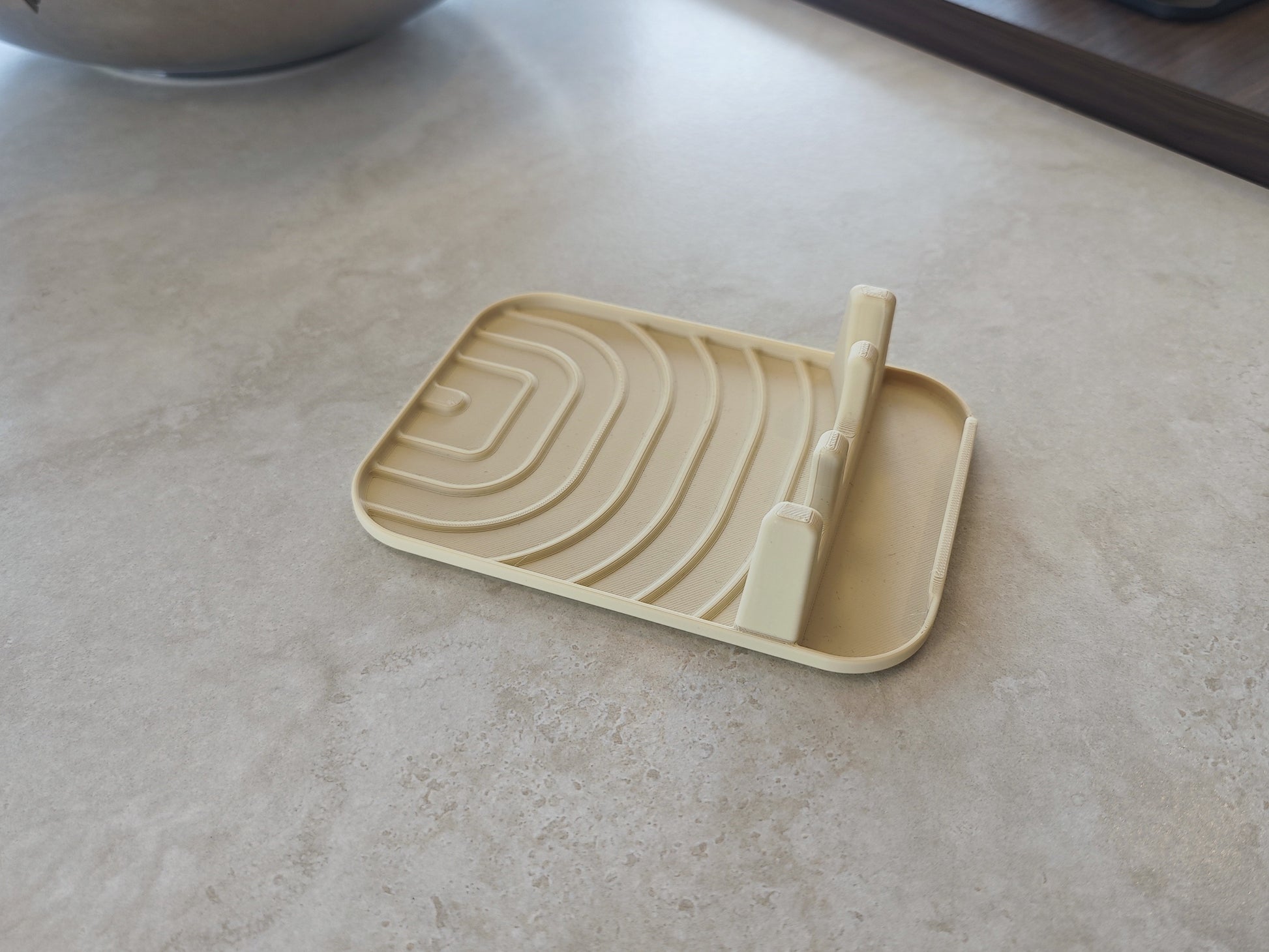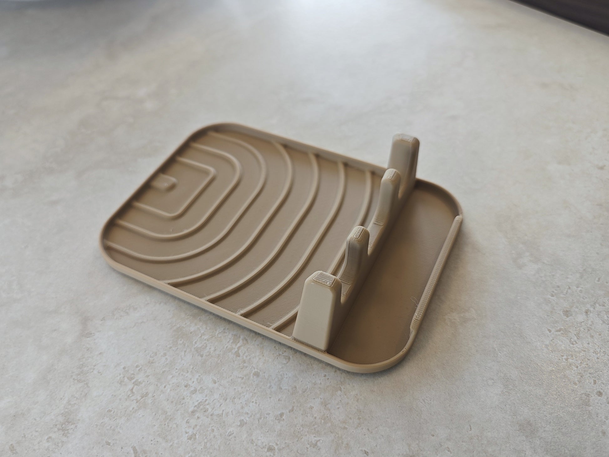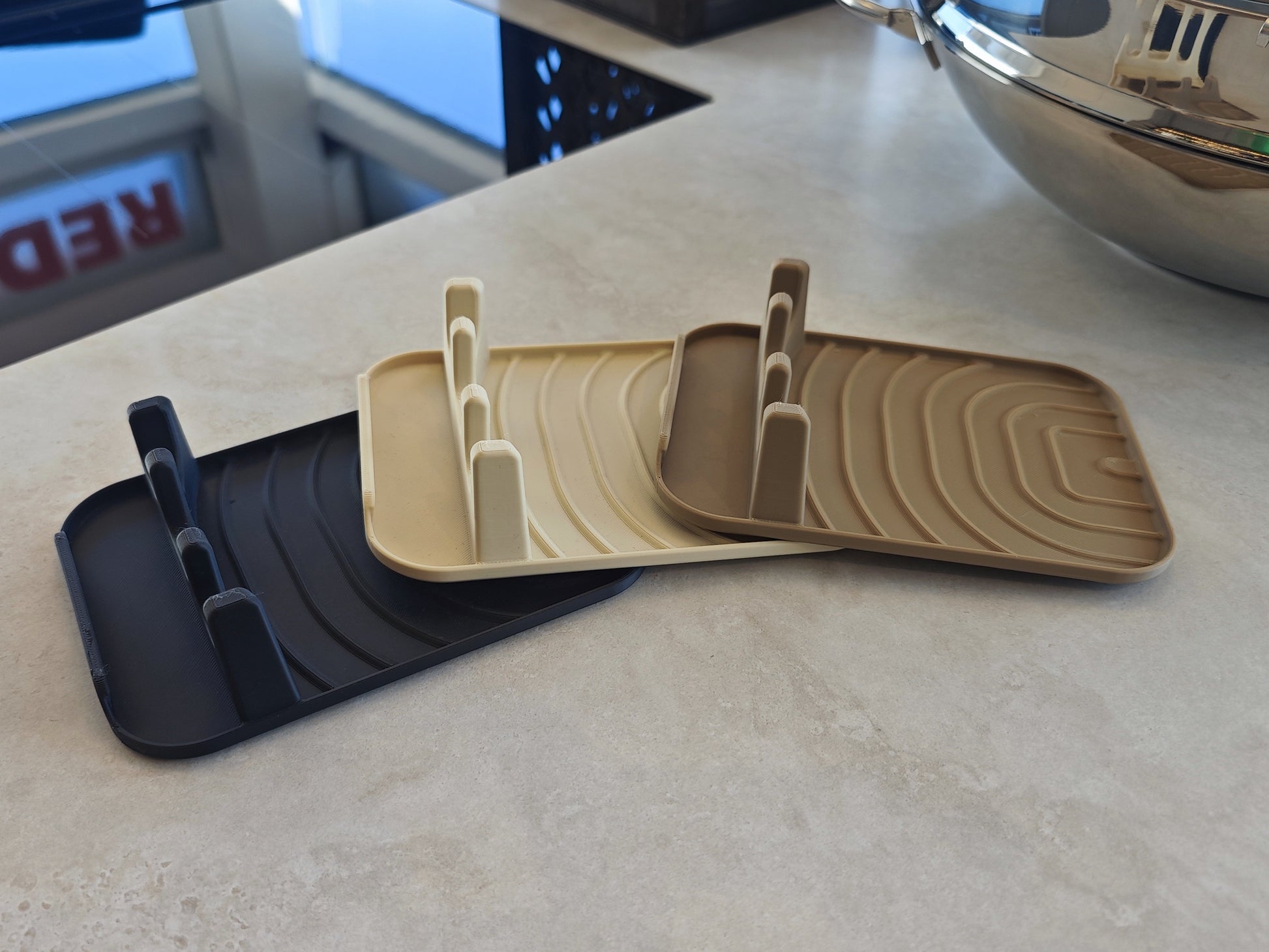Diese moderne 3D-gedruckte Küchenablage sorgt für Ordnung und Sauberkeit beim Kochen. Ob Kochlöffel, Pfannenwender oder Schneebesen – alle Utensilien können bequem abgelegt werden, ohne die Arbeitsfläche zu verschmutzen. Das elegante Design mit sanften Linien und leichter Rillenstruktur fügt sich harmonisch in jede Küche ein.